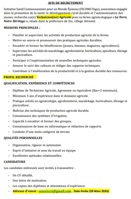 Initiative Santé Communautaire pour un Monde Épanoui (ISCOME-Togo), association engagée dans la promotion de la santé, le développement rural durable et l’autonomisation des jeunes, recherche un(e) Technicien(ne) Agricole pour sa ferme agroécologique « La Terre, Notre Héritage », située dans la préfecture de Zio, village Ativemé.